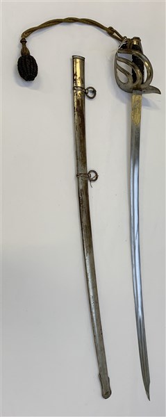 Sciabola da ufficiale superiore di un reggimento di Cavalleria del Regno d'Italia, modello degli anni '70/80 del secolo XIX. Importante lama con parti ageminate in oro all'innesto a motivi vegetali e firmata da "S. Hoppe Fils Solingen". Completa della sua dragonna da ufficiale superiore di cavalleria (l. cm 103) (in patina, da pulire)
