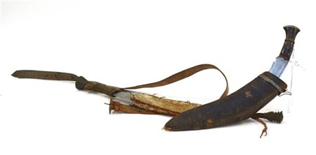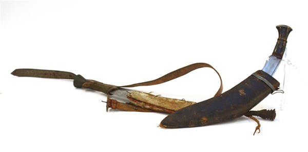 Lotto composto da due pugnali. Un Kukri nepalese con impugnatura in corno e forte lama, fodero in legno rivestito in cuoio operato a motivi geometrici, al retro i due piccoli coltelli secondo la tradizione (l. cm 43), unito ad un coltello del Corno d'Africa con impugnatura in legno rivestita di filo d'ottone, lama a doppio filo e fodero in pelle con cintura e cordella (l. cm 53) (segni del tempo)
