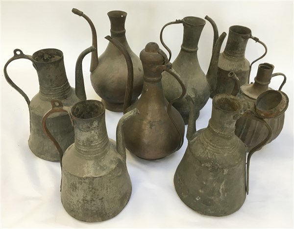Collezione di dodici versatoi in rame e metallo di diversa epoca e decoro (dife