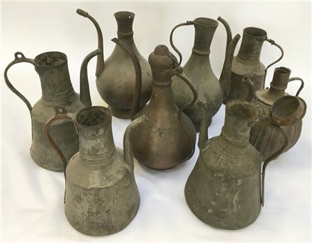Collezione di dodici versatoi in rame e metallo di diversa epoca e decoro (difetti e mancanze)