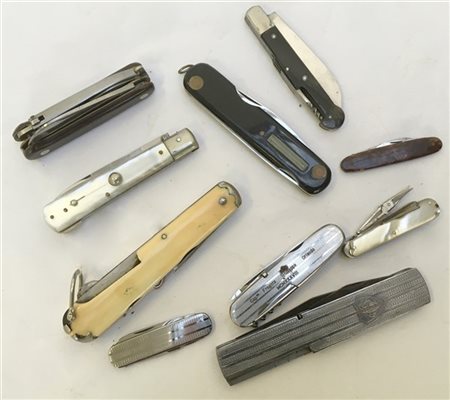 Lotto composto da dieci coltelli multiuso di varie manifatture e grandezze, alcuni con guacette in osso, avorio e madreperla. Secolo XX (segni del tempo)
