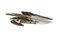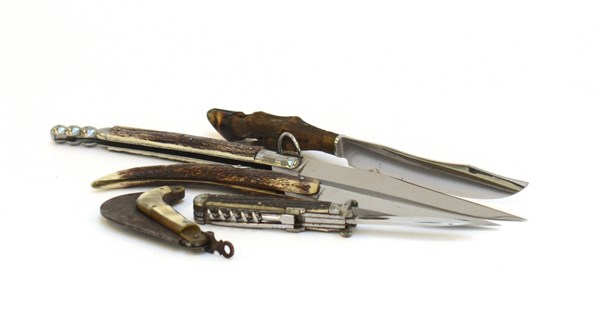 Lotto composto da due coltelli da caccia pieghevoli di produzione svizzera con manico in corno, uniti a un coltellino multiuso con guancette in corno e un coltello con impugnatura derivata da una zampa di capriolo, moderni, e una roncola pieghevole degli inizi del XX secolo