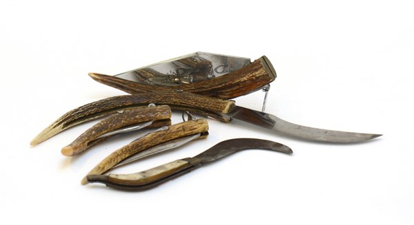 Lotto composto da quattro coltelli moderni a serramanico, due di grandi dimensioni e due di dimensioni medie, inseriti entro corni di animale; produzione austriaca, e uno di produzione italiana a Magnago. Uniti ad una vecchia roncola pieghevole degli inizi del secolo XX