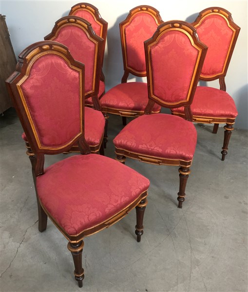 Gruppo di sei sedie con schienale sagomato e decorato da dettagli in legno chia