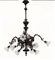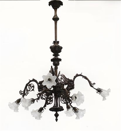 Lampadario a otto luci con struttura in ferro battuto e decorato a draghi, volute e teste di cherubini. Paralumi in vetro. Inizio secolo XX (h. cm 160)