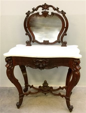 Toilette lastronata in noce di forma sagomata con specchio basculante, cassetto nella fascia. Gambe mosse e intagliate a figure femminili. Piano in marmo bianco. Secolo XIX (cm 89x133x54) (difetti)