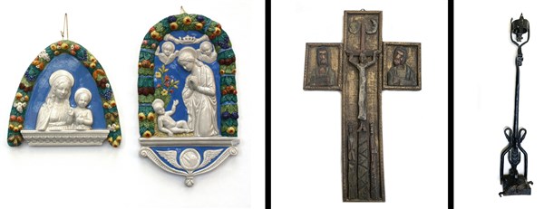 Lotto composto da due formelle in ceramica policroma, un candeliere in ferro battuto ed un crocifisso in legno (difetti)