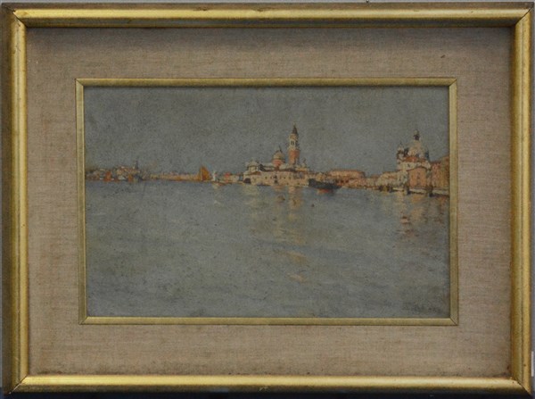 Firma indecifrata "Venezia alla Salute" olio su tavola (cm 22x34) Firmato in basso a destra. In cornice (difetti)