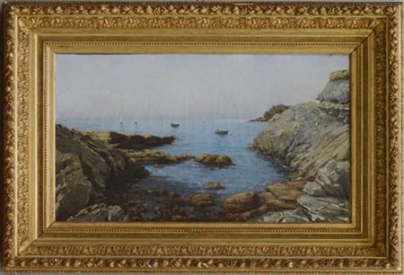 "Paesaggio marino" 1891, olio su tela (cm 50x90) Firmato e datato in basso a destra. In cornice coeva in legno e pastiglia dorata