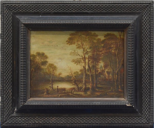 Scuola fiamminga del secolo XIX "Paesaggio con cacciatore" olio su tavola (cm 2