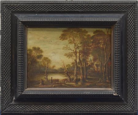 Scuola fiamminga del secolo XIX "Paesaggio con cacciatore" olio su tavola (cm 22x31). In cornice coeva