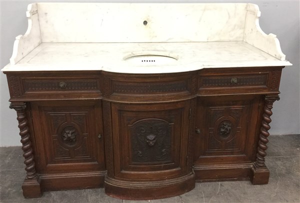 Mobile da toilette a tre ante e due cassetti con specchiera in legno intagliato a fiori, mascherone e motivi stilizzati. Montanti a colonne tortili, piano con alzata in marmo (mobile cm 145x103x65; specchiera cm 138x100) (difetti)