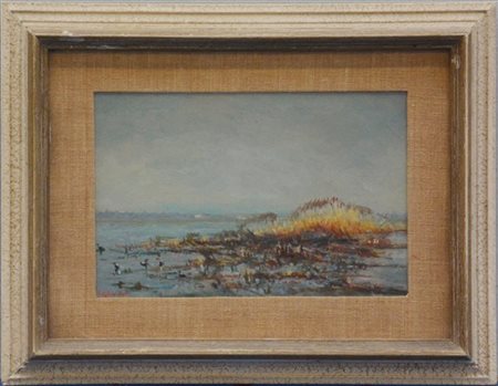 Firma indecifrata "Giornata di caccia" tecnica mista su carta (cm 20x28) Firmato in basso a sinistra. Al retro: titolato. In cornice
