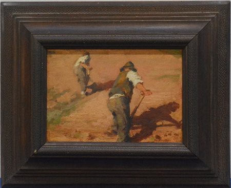 Scuola Toscana del XX Secolo "L'aratura" olio su tavola (m 15x22) In cornice
