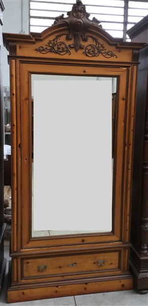 Armadio in legno ad un'anta vetrata ed un cassetto, cimasa intagliata a volute fogliate (cm 110x245x47) (difetti e mancanze)