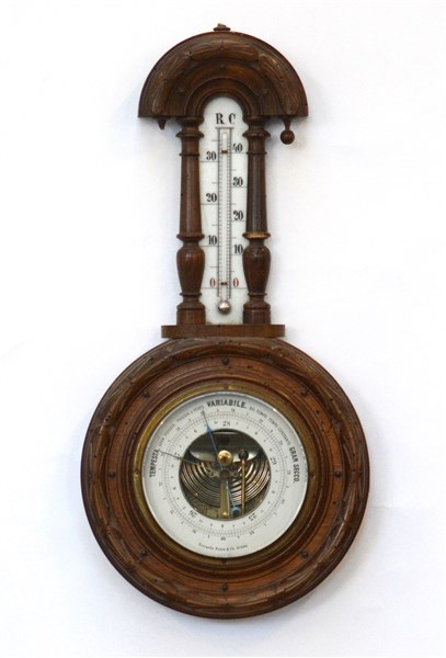 Barometro aneroide e termometro montati su cassa da parete in legno tornito e intagliato
