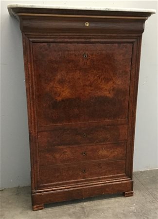Secretaire lastronato in mogano e radica di mogano, fronte a tre cassetti e mezzo, anta ribaltabile celante vani e cassetti. Piano in marmo. Secolo XIX (cm 100x152x46) (difetti e restauri)
