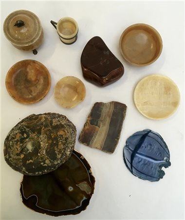 Lotto composto da un quarzo, sei oggetti diversi in alabastro, alcuni montati in argento e altre sezioni e frammenti in agata e pietre diverse (misure diverse) (difetti)
