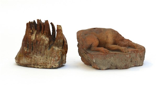 Lotto composto da una mandibola fossile e un frammento di scultura in terracotta raffigurante un felino (difetti)