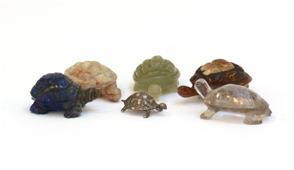 Lotto composto da sei tartarughe in materiali diversi fra i quali argento, lapislazzulo e cristallo di rocca (difetti)