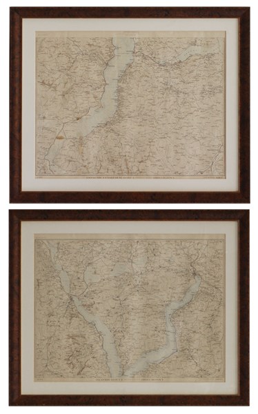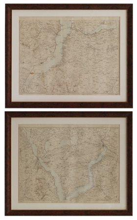 Due carte geografiche DeAgostini raffiguranti Lago di Como, i Laghi Briantei di Mezzola e del Piano, cm 60x76. In cornici laccate
