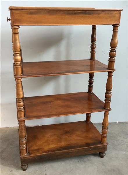 Etagere a tre ripiani, piano superiore a leggio a un cassetto nel fianco. Monta