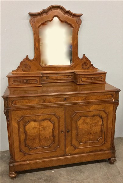 Credenza lastronata in noce e radica a due ante e un cassetto con montanti intagliati. Alzata con specchio e due cassettini. Piedi a cipolla. Secolo XIX (cm 120x95x59)