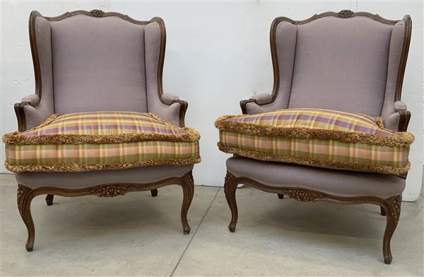 Coppia di poltrone Bergere con schienale sagomato e intagliato a fiori, montanti scanalati, gambe mosse, rivestito con tessuto lilla, cuscini imbottiti (difetti)