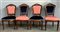 Gruppo di quattro sedie in noce con schienali mossi e traforati e gambe anteriori tornite, rivestite in raso e velluto in blu e rosa. Secolo XIX