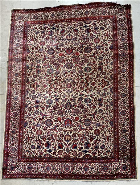 Tappeto Tabriz, Persia, secolo XX. Decoro all over floreale policromo su fondo bianco. (cm 382x264) (Gravi difetti, rotture e mancanze)