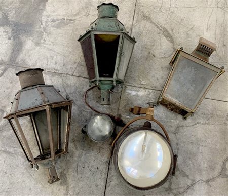 Lotto composto da due fanali e tre lanterne di epoche diverse (difetti)
