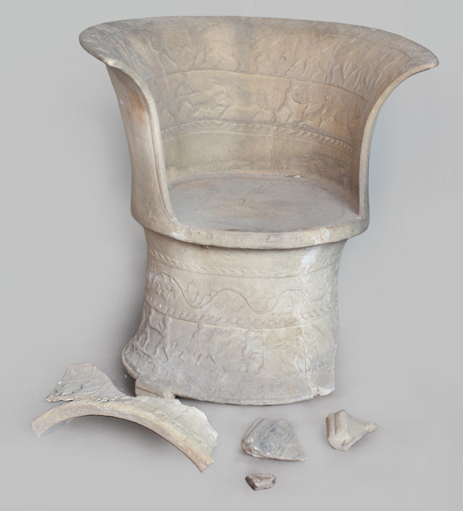 Manifattura di Signa, poltroncina in terracotta decorata in rilievo con guerrie