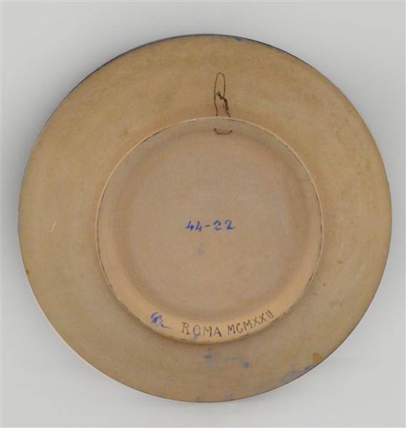 Piatto in terracotta decorato in policromia in stile antico (d cm 42) iscritto al retro Roma MCMXXII
