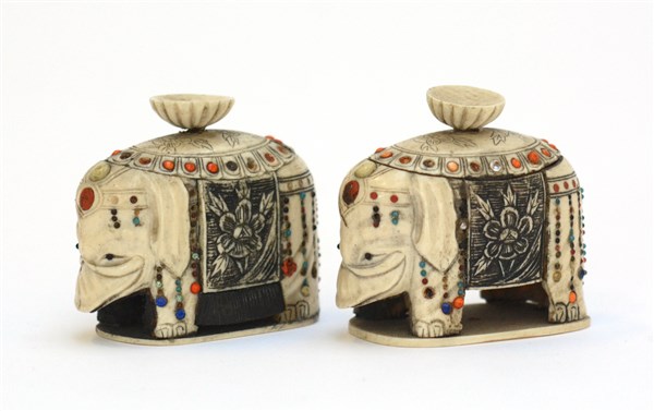 Manifattura orientale secolo XIX, coppia di elefanti in avorio inciso e decorato a cabochon di paste vitree (difetti e mancanze)