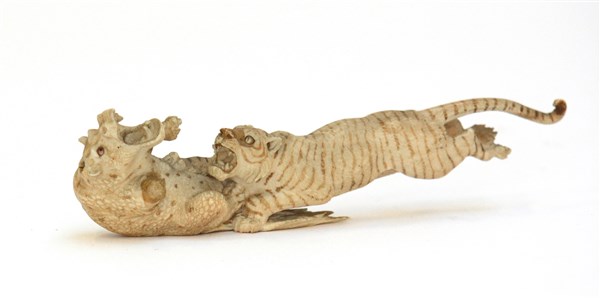 Arte giapponese secolo XIX, gruppo in avorio raffigurante una lotta tra tigre e