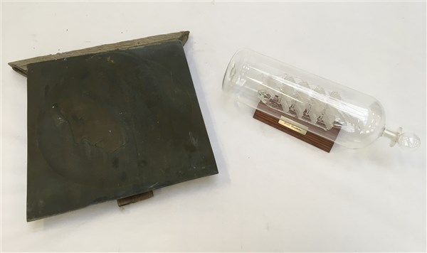 Lotto composto da un rilievo in bronzo raffigurante volto di Madonna ed una bottiglia in vetro contenente caravella (difetti)