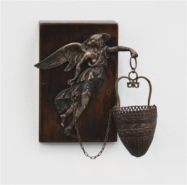 Acquasantiera del secolo XIX in argento sbalzato a figura di angelo che sorregg