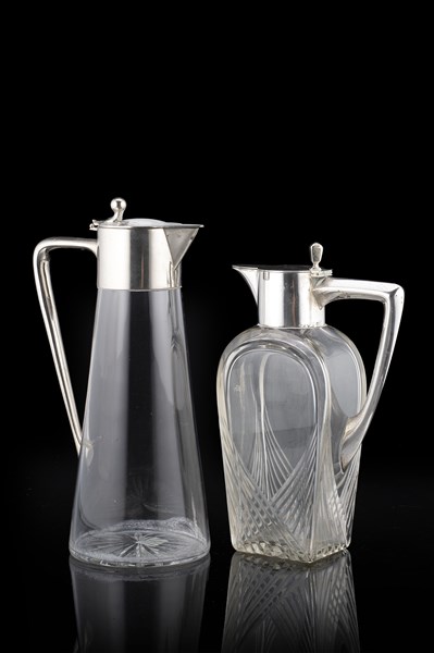 Lotto composto da due caraffe in vetro con ghiere in argento e metallo argentat