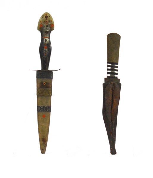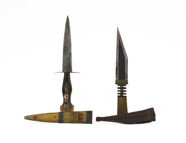 Piccolo pugnale con lama a doppio filo, impugnatura e fodero in corno biondo arricchito da parti metalliche incise (l. cm 17), e altro piccolo pugnale con impugnatura in ottone, lama a doppio filo e fodero in cuoio operato a motivi geometrici (l. cm 14). Fine del secolo XIX (usura del tempo)