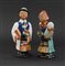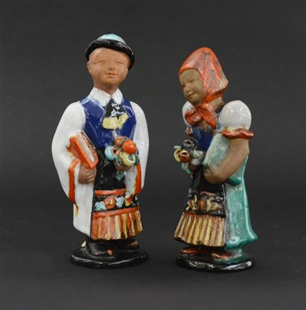 Coppia di sculture in ceramica smaltata in policromia sotto vetrina, raffiguranti un uomo e una donna in abiti tradizionali. Anni '20. Firma indecifrata sotto la base. (h cm 19)