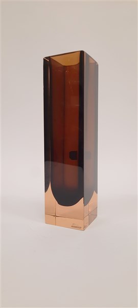 Vaso parallelepipedo in vetro sommerso ambrato. Murano, anni '60/'70. Recante etichetta adesiva "V. Nason & C. Murano Italy". (cm 6,5x25x6,5)