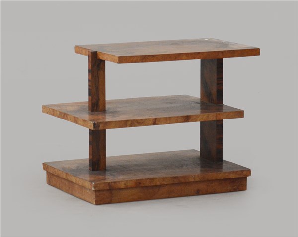 Etagere di gusto déco in legno impiallacciato in radica a tre ripiani. Italia,