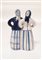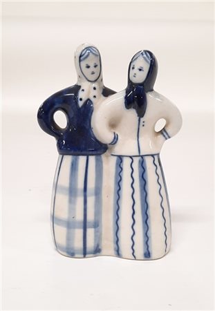 Scultura in ceramica smaltata sotto vetrina dei toni del bianco e del blu raffigurante due donne in abiti tradizionali. Russia, anni '30. Marcate sotto la base. (h cm 14)