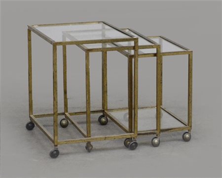 Gruppo di carrellini a nido con struttura in ottone e piano in vetro. Italia, anni '70. (carrello maggiore cm 48x51x38; carrello medio cm 4x47x34; carrello piccolo cm 40x42,5x30) (difetti)