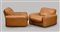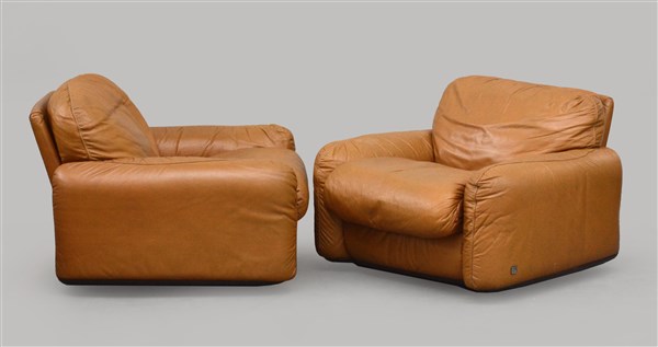 Coppia di poltrone modello "Piumotto". Produzione Busnelli, Italia, anni '70. Rivestimento in pelle ocra. (cm 90x70x88) (lievi difetti)