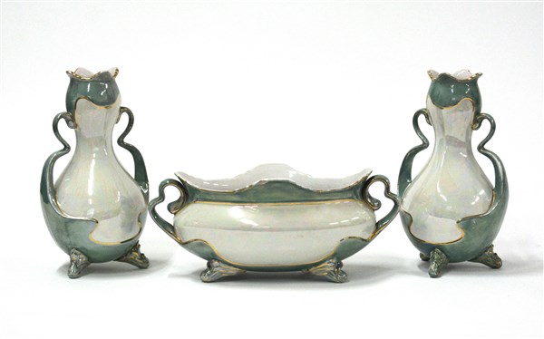 Lotto composto da due vasi ansati ed un centrotavola in ceramica smaltata a lustro metallico nei toni del bianco, verde e oro. Laveno, secolo XX. Marcati con il simbolo grafico della manifattura sotto la base. (vaso cm h 32; centrotavola cm 40x17x20) (lievi difetti)