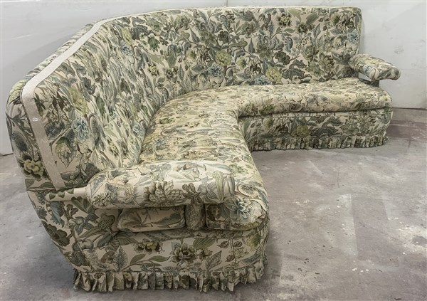 Divano angolare con braccioli imbottito e rivestito in tessuto floreale. Italia, anni '80. (cm 291x88) (difetti)