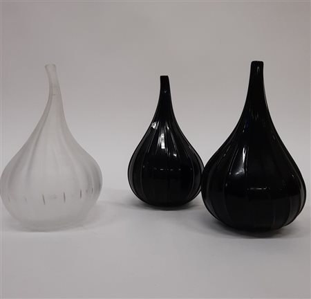 Lotto composto da tre vasi soliflore della serie "Drops". Murano, produzione recente. Vetro acidato incolore e nero. Firmati e datati all'acido sotto la base. Una scatola originale. (h cm 20)