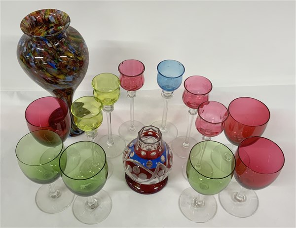 Lotto composto da sei bicchieri da acqua e sei da liquore con coppe in vetro soffiato trasparente verdino e rosso uniti a e due vasetti di epoche diverse. Italia, secolo XX. (misure diverse) (difetti)