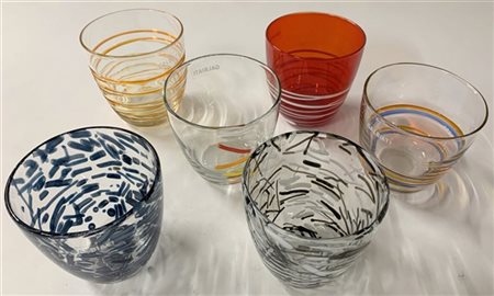 Sei bicchieri in vetro incolore trasparenti con decori policromi diversi in rilievo. Milano, produzione recente. Recanti l'etichetta adesiva e in scatola originale. (h cm 9,5; d cm 9,5)